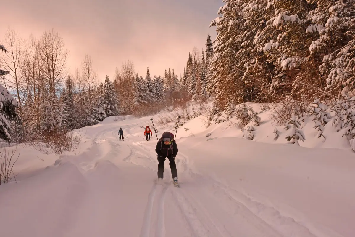 The sun was out, and it was a beautiful day! Things were steady and easy, until they weren’t. Skiing up a road brought us to the bottom of a steep willowy section. Let’s just say that by the time we got to the top of it we had all gotten better at kick turns. We then discovered someone else’s up track on an old road and we chuckled to ourselves that we may not have taken the easiest line after all, but we were happy to have gotten in some practice in setting tracks and choosing lines through more difficult terrain.