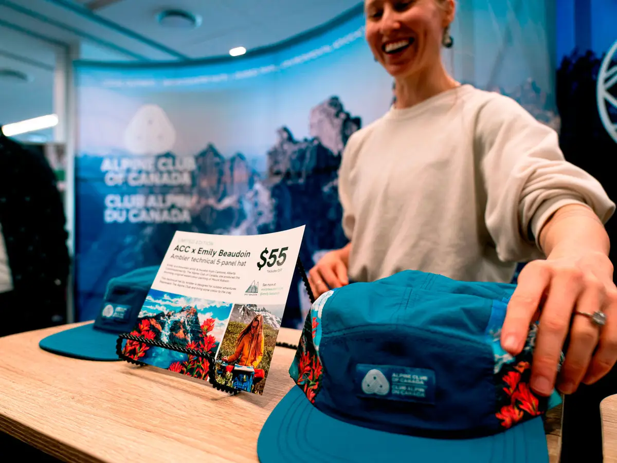 The festival marketplace is a great opportunity for our staff to engage with some of our amazing community members. This year, we had our biggest presence ever, with three booths! The booths had plenty of Gazettes, Hut Guides, and stickers to hand out, but the crowd favourite was our new technical five-panel hat. The hat features the ACC logo and beautiful artwork of Mount Robson by local Bow Valley artist Emily Beaudoin. Profits from the sales go towards completing the newest ACC Robson Pass Hut. Not only that, they will be DOUBLED as part of our matching campaign made possible by the Sarjeant family. Thank you to the Sarjeant family for increasing the impact of this initiative.