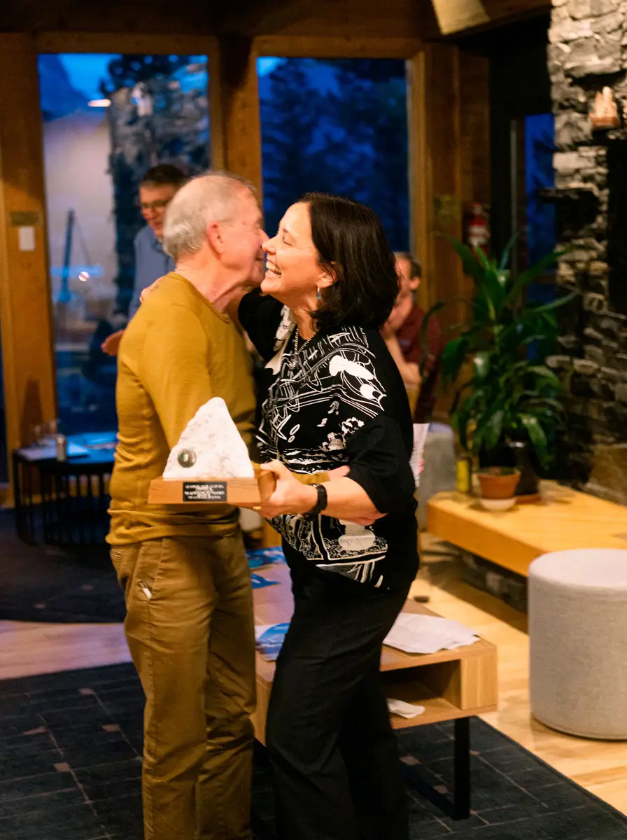 Since last year was such a success amongst attendees, we followed the same formula for 2025. The event kicked off with a pinning ceremony to welcome 12 new certified mountain guides to the ACMG team. Rather than have a Patron of the event, we chose to honour glaciers this year in recognition of the International Year of Glaciers’ Preservation. Claire Wright presented the repeat photography work that she and her team have carried out with the help of the ACC Environment Grant. The Honorary Membership Award was presented to Roger Laurilla for his strong and sustained commitment to Canadian mountaineering and outstanding service to the climbing community.